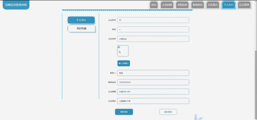 个人中心,在个人中心页面企业通过填写企业账号、密码、企业名称、上传图片、联系人、联系电话、企业邮箱、企业地址等信息进行更新信息,用户也可以通过填写用户的信息进行更新操作,还可以根据需要对我的收藏进行详细操作,如图5-5所示。