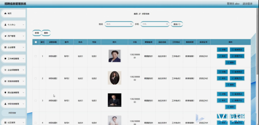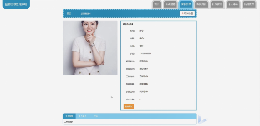 求职信息,在求职信息页面可以查看求职标题、账号、姓名、图片、性别、手机、期望薪资、岗位名称、工作地点、教育背景、获奖证书、点击次数、工作经验、个人简介等详细内容,并进行邀请面试,评论或收藏操作;如图5-3所示。