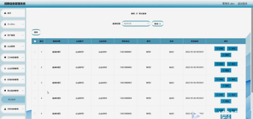 面试邀请管理,在面试邀请管理页面可以对索引、邀请标题、企业账号、企业名称、联系电话、账号、姓名、发送时间等内容进行详情,修改和删除等操作,如图5-12所示。