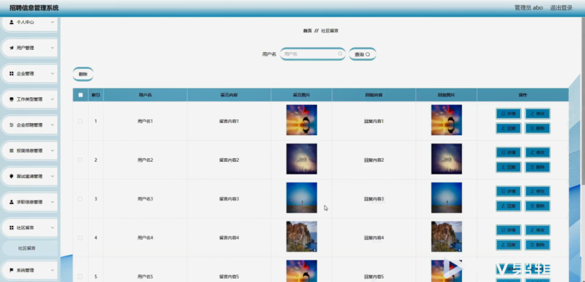 社区留言,在社区留言页面可以对索引、用户名、留言内容、留言图片、回复内容、回复图片等内容进行详情,修改,回复或删除操作,如图5-14所示。