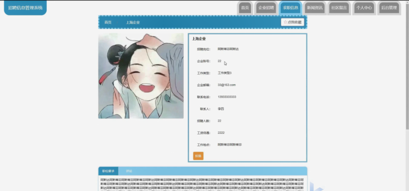 企业招聘,在企业招聘页面可以查看企业名称、招聘岗位、图片、企业账号、工作类型、企业邮箱、联系电话、联系人、招聘人数、工资待遇、工作地点、职位要求等详细内容,并进行投简,评论或收藏操作,如图5-2所示。
