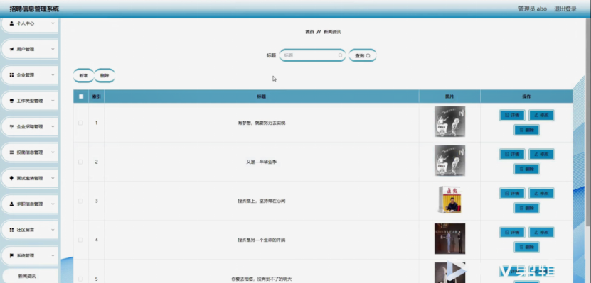 系统管理,在新闻资讯页面可以对索引、标题、图片等内容进行详情,修改和删除操作,还可以对轮播图管理进行详细操作;如图5-15所示。