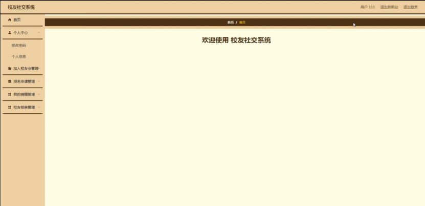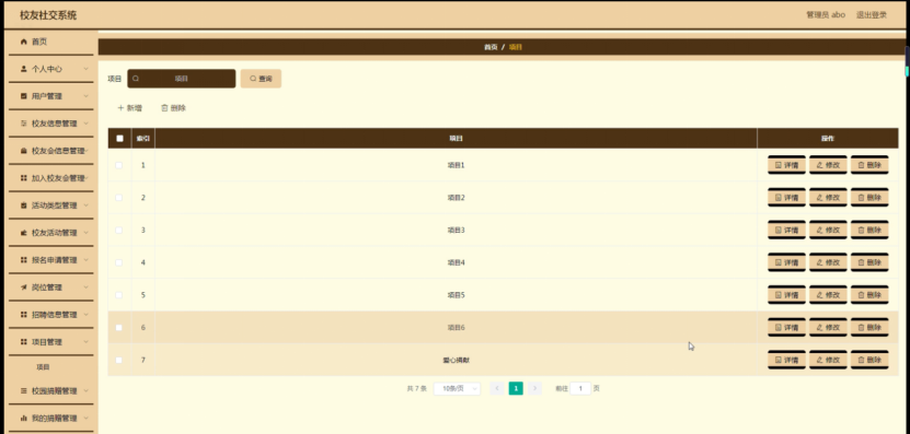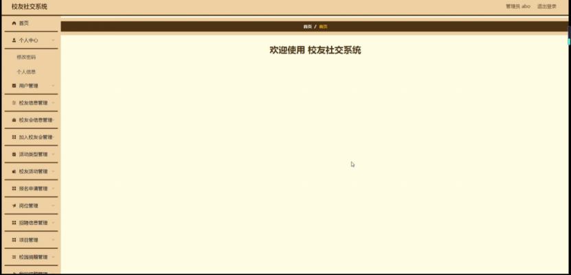系统主要分为系统管理员和用户两个部分,系统管理员主要包括首页、个人中心、用户管理、校友信息管理、校友会信息管理、加入校友会管理、活动类型管理、校友活动管理、报名申请管理、岗位管理、招聘信息管理、项目管理、校园捐赠管理、我的捐赠管理、校友相亲管理、论坛中心、系统管理;基本上实现了整个校友社交系统信息管理的过程。