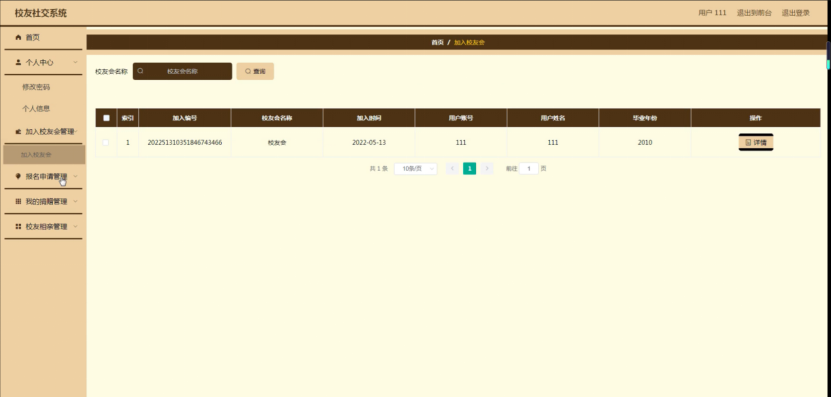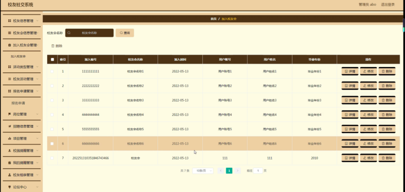 加入校友会管理,在加入校友会管理页面可以对索引、加入编号、校友会名称、加入时间、用户账号、用户姓名、毕业年份等内容进行详情、修改或删除等操作,如图5-9所示。