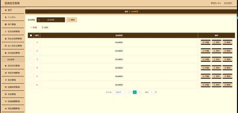 活动类型管理,在活动类型管理页面可以对索引、活动类型等内容进行详情、修改或删除等操作,如图5-10所示。
