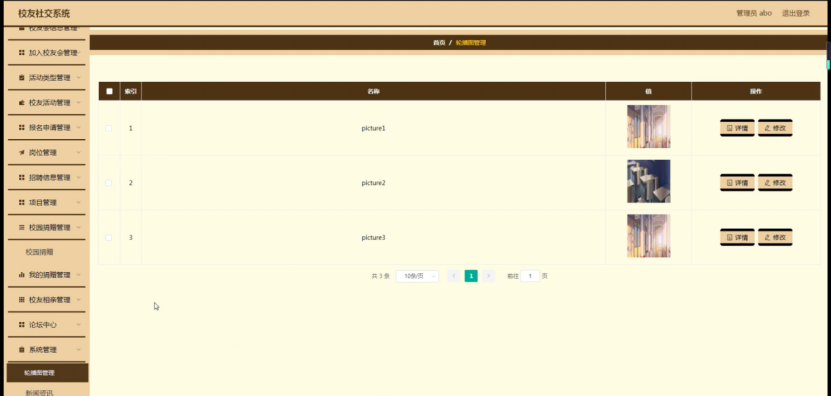 系统管理,在轮播图管理页面可以对索引、名称、值等内容进行详情、修改等操作,并根据需要进行详细操作,如图5-19所示。