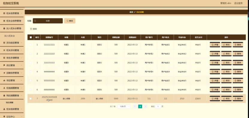 我的捐赠管理,在我的捐赠管理页面可以对索引、捐赠编号、标题、年度、项目、捐赠金额、捐赠时间、用户账号、用户姓名、毕业年份、是否支付等内容进行详情、修改或删除等操作,如图5-17所示。