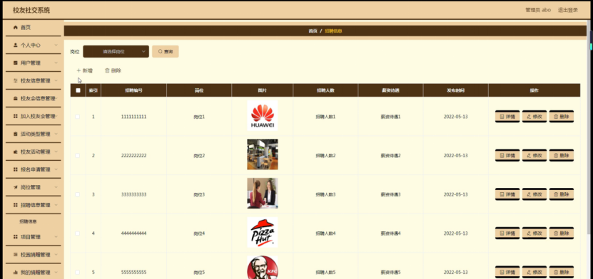 招聘信息管理,在招聘信息管理页面可以对索引、招聘编号、岗位、图片、招聘人数、薪资待遇、发布时间等内容进行详情、修改或删除等操作,如图5-14所示。