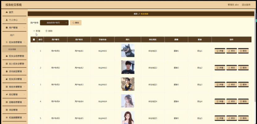 校友信息管理,在校友信息管理页面可以对索引、用户账号、用户姓名、毕业年份、图片、所在地区、薪酬、职业等内容进行详情,修改或删除等操作,如图5-7所示。