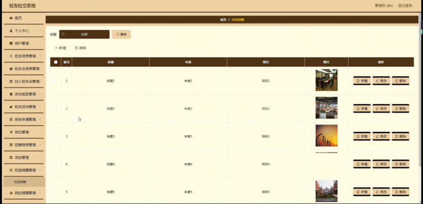 校园捐赠管理,在校园捐赠管理页面可以对索引、标题、年度、项目、图片等内容进行详情、修改或删除等操作,如图5-16所示。