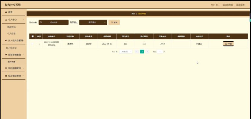 加入校友会管理,在加入校友会管理页面可以对索引、加入编号、校友会名称、加入时间、用户账号、用户姓名、毕业年份等内容进行详情等操作,如图5-21所示。