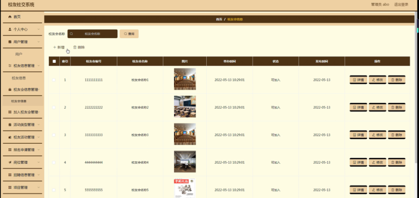 校友会信息管理,在校友会信息管理页面可以对索引、校友会编号、校友会名称、图片、举办时间、状态、发布时间等内容进行详情,修改或删除等操作,如图5-8所示。
