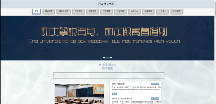 校友社交系统,在系统首页可以查看首页、校友信息、校友会信息、校友活动、招聘信息、校园捐赠、校友相亲、论坛中心、新闻资讯、个人中心、后台管理等内容进行详细操作,如图5-1所示。