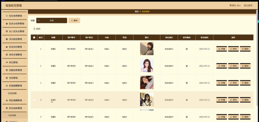 校友相亲管理,在校友相亲管理页面可以对索引、标题、用户账号、用户姓名、年龄、性别、图片、所在城市、是否购房、发布时间等内容进行详情、修改或删除等操作,如图5-18所示。