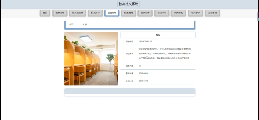 招聘信息,在招聘信息页面可以查看招聘名称、招聘编号、岗位要求、招聘人数、薪资待遇、发布时间、图片等详细信息,如图5-4所示。