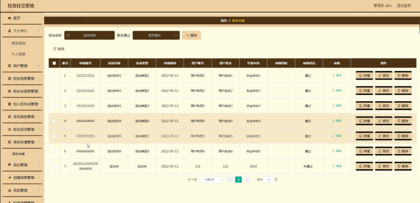 报名申请管理,在报名申请管理页面可以对索引、申请编号、活动名称、活动类型、申请时间、用户账号、用户姓名、毕业年份、审核回复、审核状态、审核等内容进行详情、修改或删除等操作,如图5-12所示。