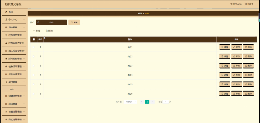 岗位管理,在岗位管理页面可以对索引、岗位等内容进行详情、修改或删除等操作,如图5-13所示。