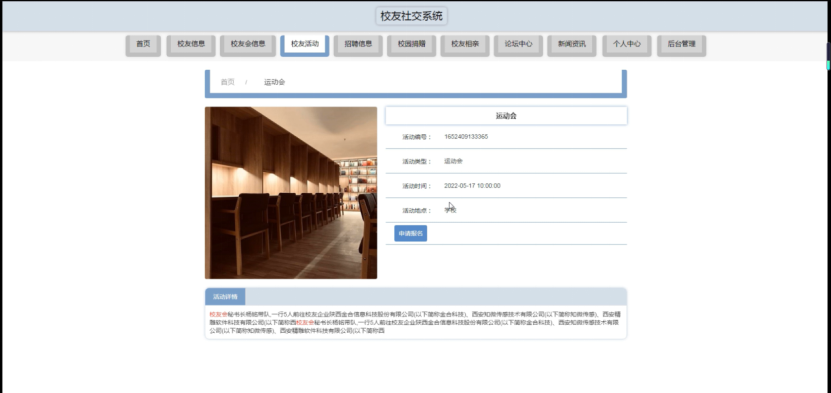 校友活动,在校友活动页面可以查看活动名称、活动类型、活动时间、活动地点、活动详情、图片等详细信息,并进行申请报名操作如图5-3所示。