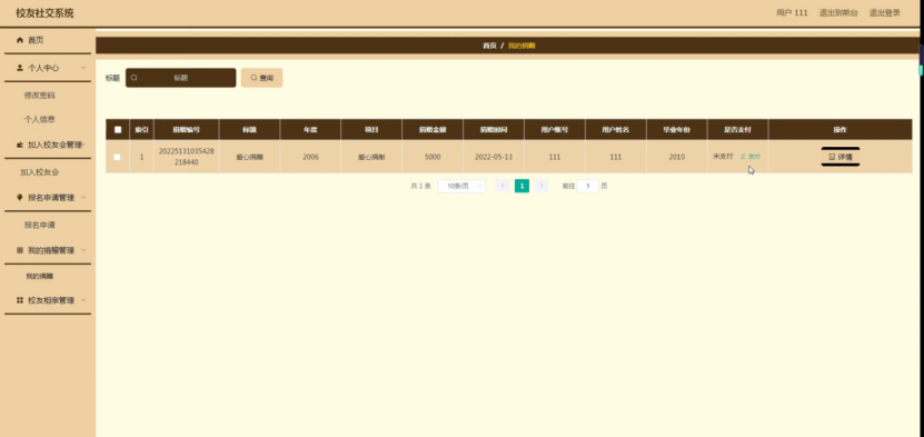 我的捐赠管理,在我的捐赠管理页面可以对索引、捐赠编号、标题、年度、项目、捐赠金额、捐赠时间、用户账号、用户姓名、毕业年份、是否支付等内容进行详情等操作,如图5-23所示。