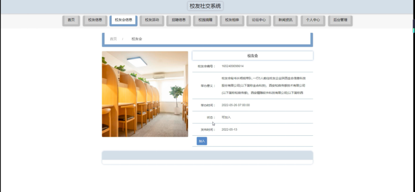 校友会信息,在校友会信息页面可以查看校园会编号、举办意义、举办时间、状态、发布时间、图片等内容,并进行加入操作,如图5-2所示。