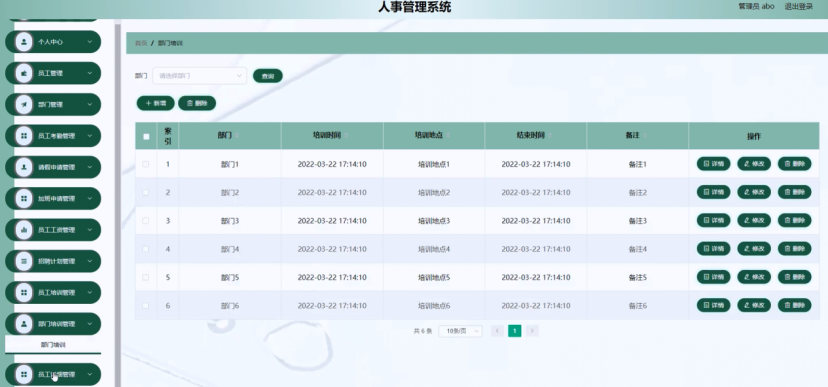部门培训管理,在部门培训管理页面可以对索引,部门,培训时间,培训地点,结束时间,备注等内容进行详情,修改和删除等操作,如图5-9所示。