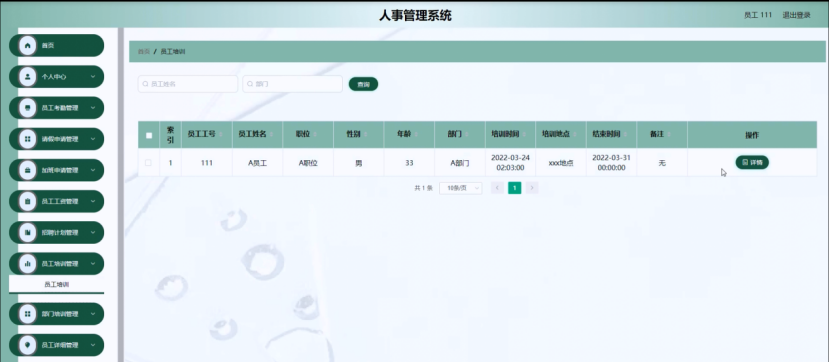 员工培训管理,在员工培训管理页面可以对索引,员工工号,员工姓名,职位,性别,年龄,部门,培训时间,培训地点,结束时间,备注等内容进行详情等操作,如图5-15所示。