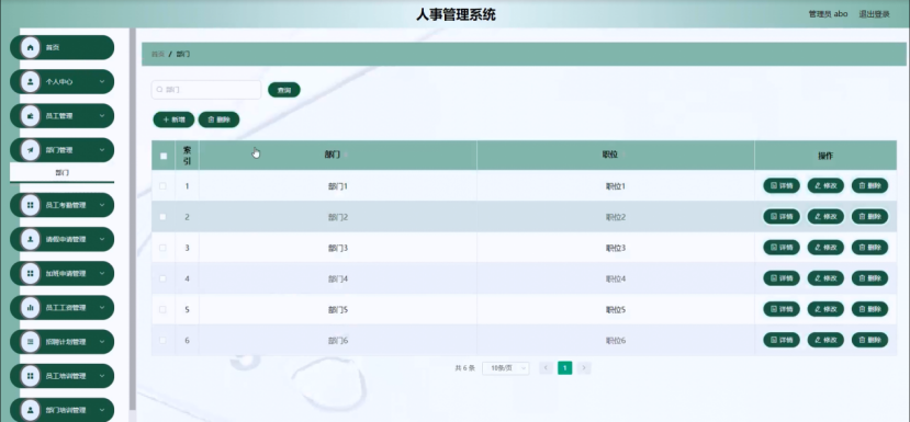 部门管理,在部门管理页面可以对索引,部门,职位等内容进行详情,修改和删除等操作,如图5-4所示。