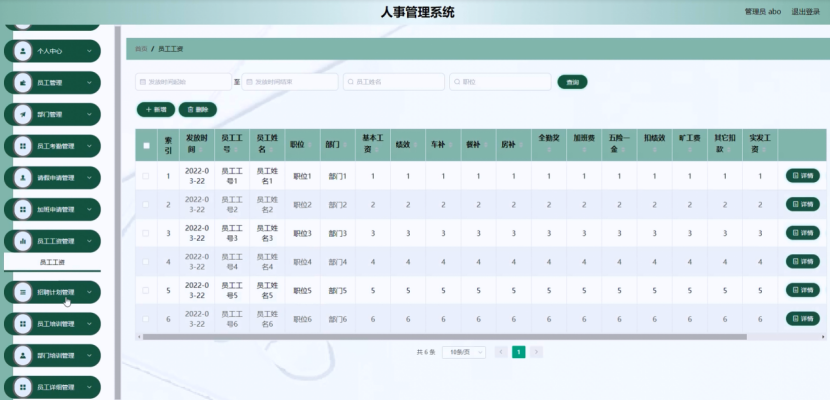 员工工资管理,在员工工资管理页面可以对索引,发放时间,员工工号,员工姓名,职位,部门,基本工资,绩效,车补,餐补,房补,全勤奖,加班费,五险一金,扣绩效,旷工费,其它扣款,实发工资等内容进行详情,修改和删除等操作,如图5-7所示。