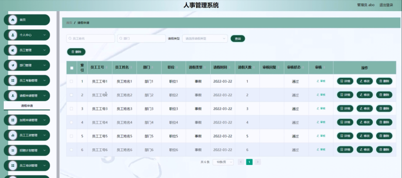 请假申请管理,在请假申请管理页面可以对索引,员工工号,员工姓名,部门,职位,请假类型,请假时间,请假天数,审核回复,审核状态,审核等内容进行详情,修改和删除等操作,如图5-6所示。