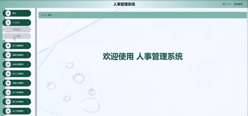 员工登录进入人事管理系统可以对首页,个人中心,员工考勤管理,请假申请管理,加班申请管理,员工工资管理,招聘计划管理,员工培训管理,部门培训管理,员工详细管理等进行相应操作,如图5-11所示。