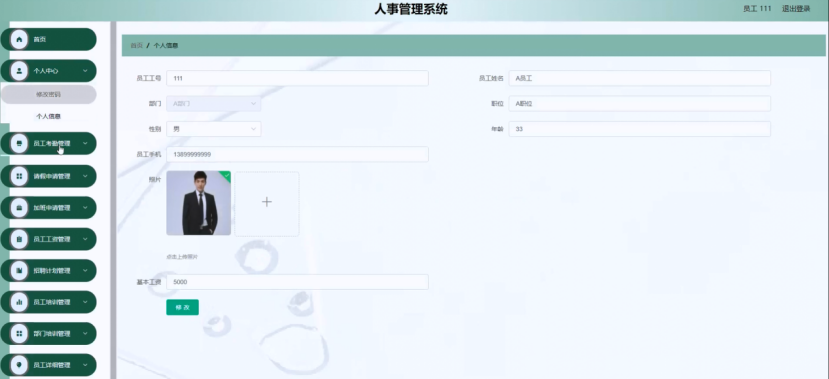 个人中心,在个人信息页面通过填写员工工号,员工姓名,部门,职位,性别,年龄,员工手机,照片,基本工资等内容对个人信息进行修改操作,如图5-12所示。
