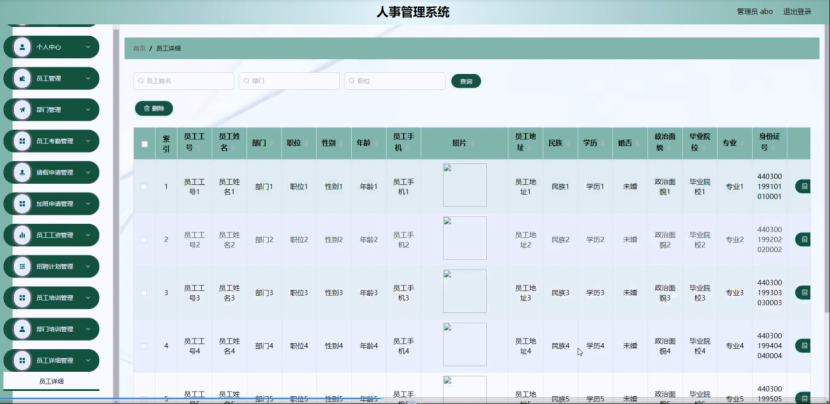 员工详细管理,在员工详细管理页面可以对索引,员工工号,员工姓名,部门,职位,性别,年龄,员工手机,照片,员工地址,名族,学历,婚否,政治面貌,毕业院校,专业,身份证号等内容进行详情,修改和删除等操作,如图5-10所示。