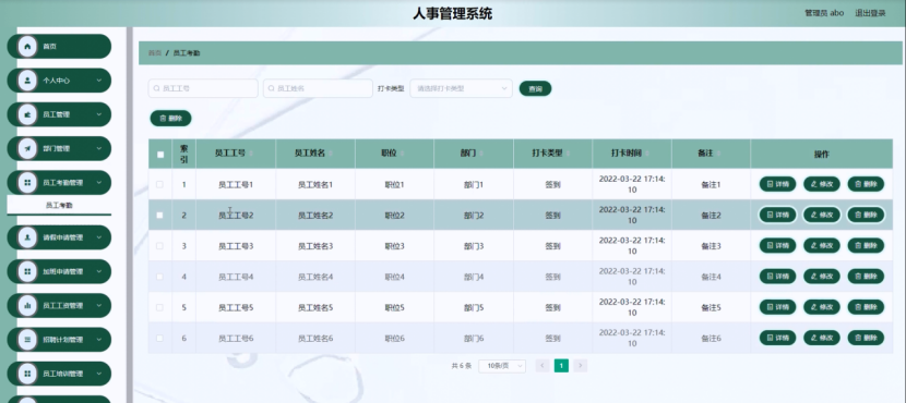 员工考勤管理,在员工考勤管理页面可以对索引,员工工号,员工姓名,职位,部门,打卡类型,打卡时间,备注等内容进行详情,修改和删除等操作,如图5-5所示。