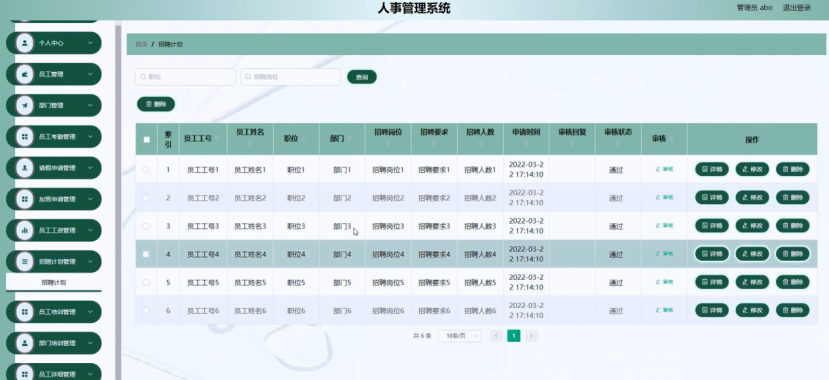 招聘计划管理,在招聘计划管理页面可以对索引,员工工号,员工姓名,职位,部门,招聘岗位,招聘要求,招聘人数,申请时间,审核回复,审核状态,审核等内容进行详情,修改和删除等操作,如图5-8所示。