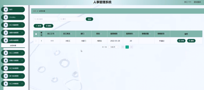 加班申请管理,在加班申请管理页面可以对索引,员工工号,员工姓名,部门,职位,加班时间,加班时长,审核回复,审核状态等内容进行详情和删除等操作,如图5-14所示。
