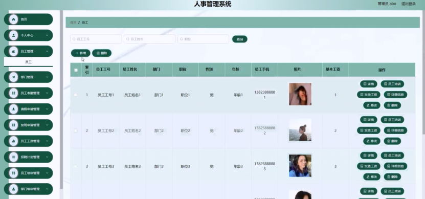 学生管理,在学生管理页面可以对索引,员工工号,员工姓名,部门,职位,性别,年龄,员工手机,照片,基本工资等内容进行详情,员工培训,发放工资,详细信息,修改和删除等操作,如图5-3所示。