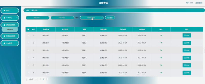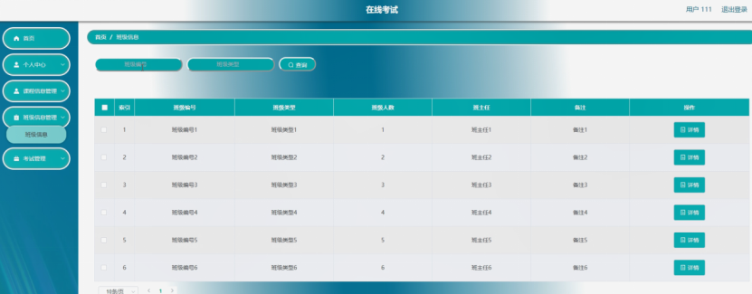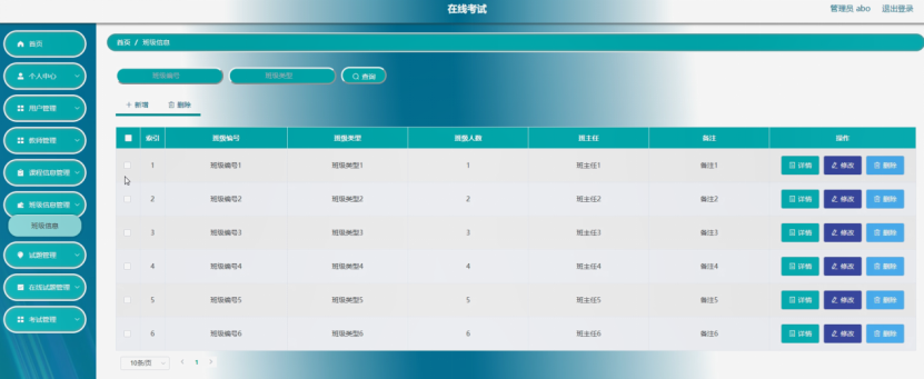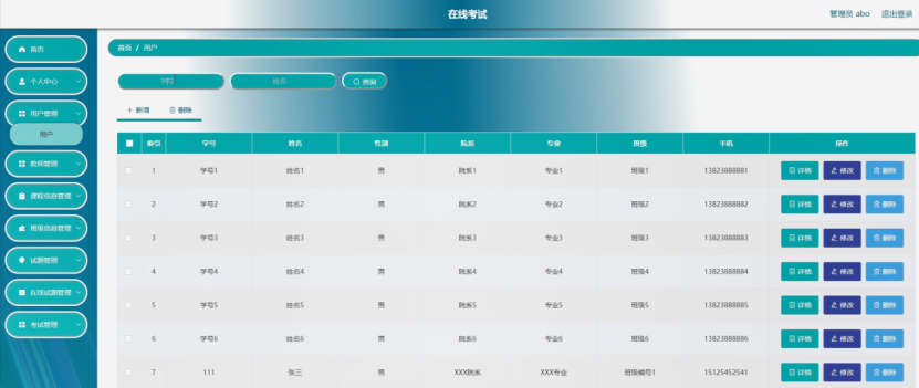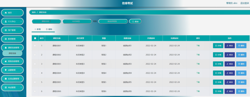 本系统主要包括管理员和用户两个角色组成;主要包括首页、个人中心、用户管理、教师管理、课程信息管理、班级信息管理、试题管理、在线试题管理、考试管理等功能的管理系统。