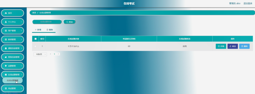 在线试题管理,在在线试题管理页面可以对索引、在线试题名称、考试时长(分钟)在线试题状态等内容进行详情,修改和删除等操作;如图5-9所示。
