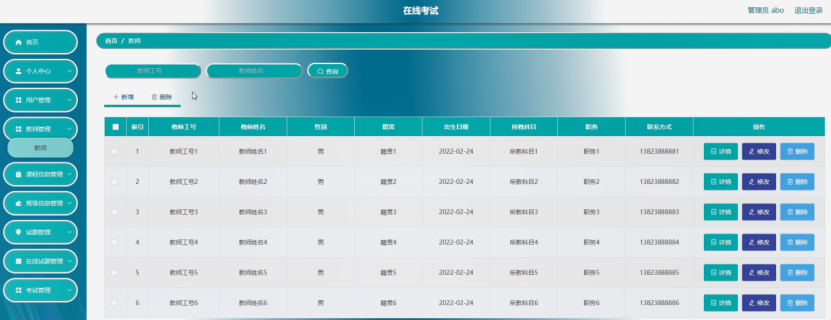 教师管理,在教师管理页面可以对索引、教师工号、教师姓名、性别、籍贯、出生日期、所教科目、职务、联系方式等信息进行详情,修改或删除操作,如图5-5所示。