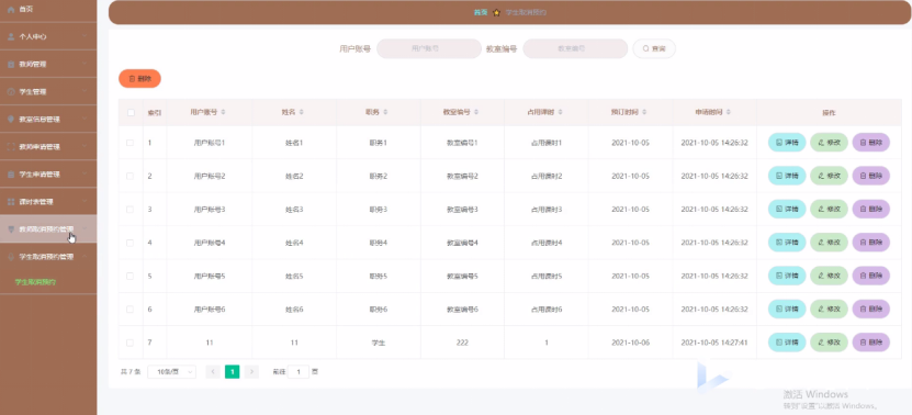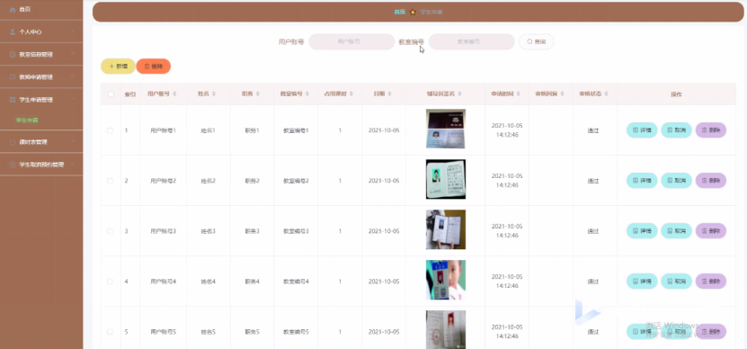 学生申请管理,在学生申请管理页面中可以对索引、用户账号、姓名、职务、教室编号、占用课时、日期、辅导员签名、申请时间、审核回复、审核状态、审核等内容进行详情、课表、修改或删除等操作,如图5-7所示。