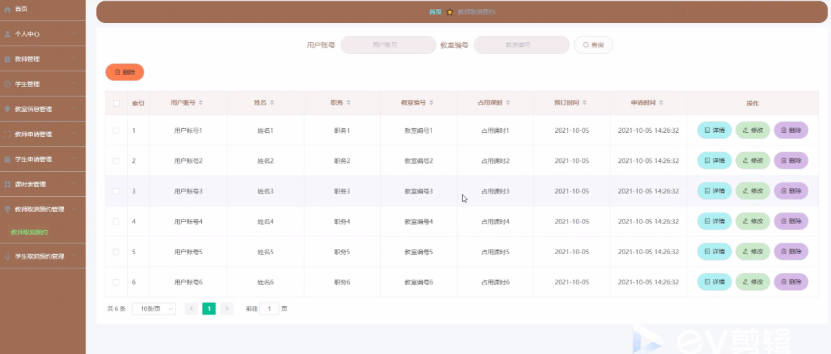 教师取消预约管理,在教师取消预约管理页面中可以对索引、用户账号、姓名、职务、教室编号、占用课时、预订时间、申请时间等内容进行详情、修改或删除等操作,如图5-9所示。