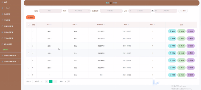 课时表管理,在课时表管理页面中可以对索引、姓名、职务、教室编号、日期、课时等内容进行详情、修改或删除等操作,如图5-15所示。