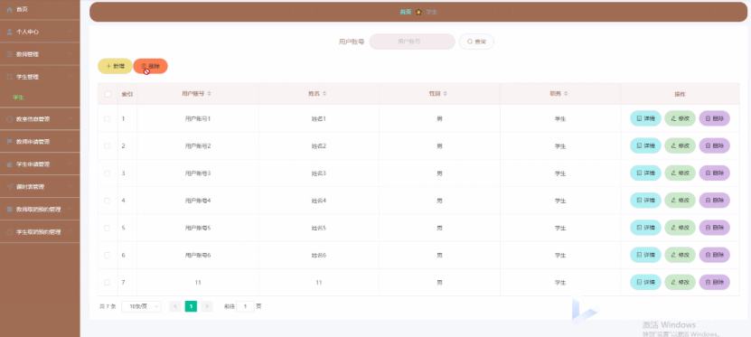 学生管理,在学生管理页面中可以对索引、用户账号、姓名、性别、职务等内容进行详情、修改或删除等操作,如图5-4所示。