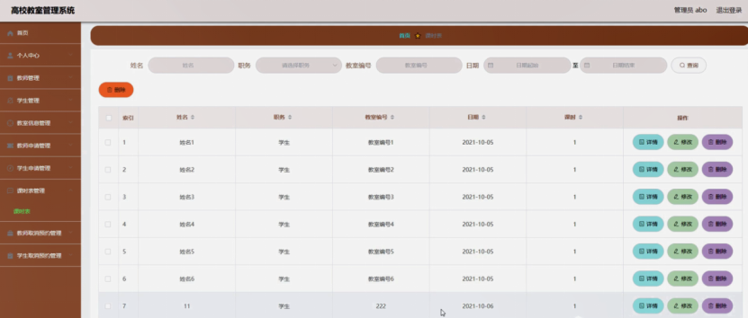 高校教室管理系统,主要的模块包括查看首页、个人中心、教师管理、学生管理、教室信息管理、教师申请管理、学生申请管理、课时表管理、教师取消预约管理、学生取消预约管理等功能。系统中管理员主要是为了安全有效地存储和管理各类信息,还可以对系统进行管理与更新维护等操作,并且对后台有相应的操作权限。