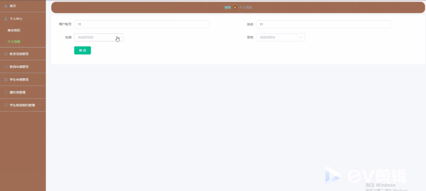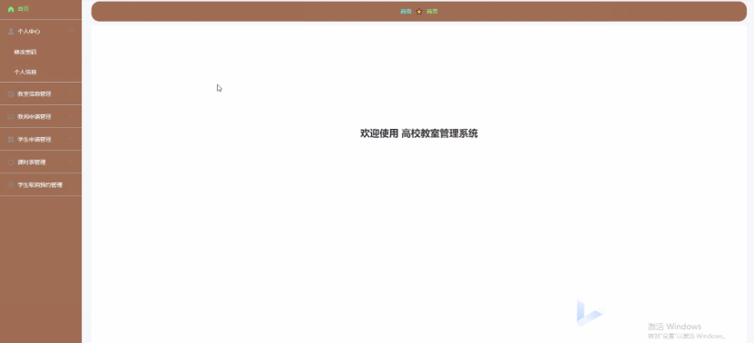 学生登录进入高校教室管理系统可以查看首页、个人中心、教室信息管理、学生申请管理、课时表管理、学生取消预约管理等内容进行详细操作,如图5-11所示。