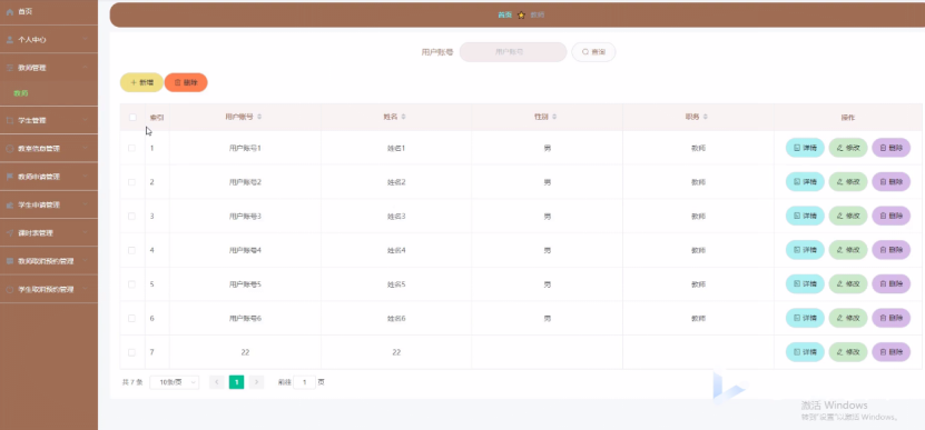 教师管理,在教师管理页面中可以对索引、用户账号、姓名、性别、职务等内容进行详情、修改或删除等操作,如图5-3所示。