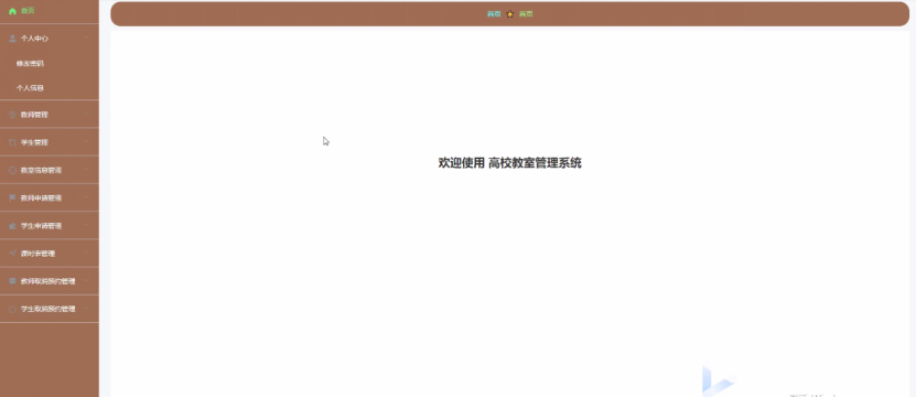 管理员登录进入高校教室管理系统可以查看首页、个人中心、教师管理、学生管理、教室信息管理 、教师申请管理、学生申请管理、课时表管理、教师取消预约管理、学生取消预约管理等内容进行详细操作,如图5-2所示。