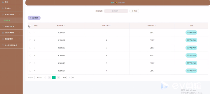 教室信息管理,在教室信息管理页面中可以对索引、教室编号、容纳人数、教室状态等内容进行学生申请操作,如图5-13所示。