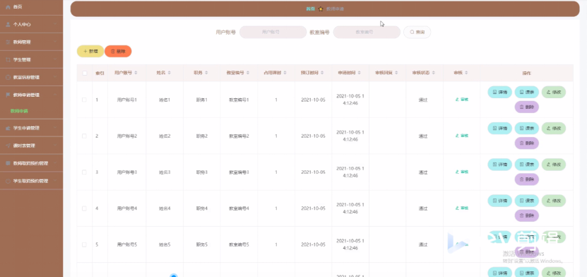 教师申请管理,在教师申请管理页面中可以对索引、用户账号、姓名、职务、教室编号、占用课时、预订时间、申请时间、审核回复、审核状态、审核等内容进行详情、课表、修改或删除等操作,如图5-6所示。