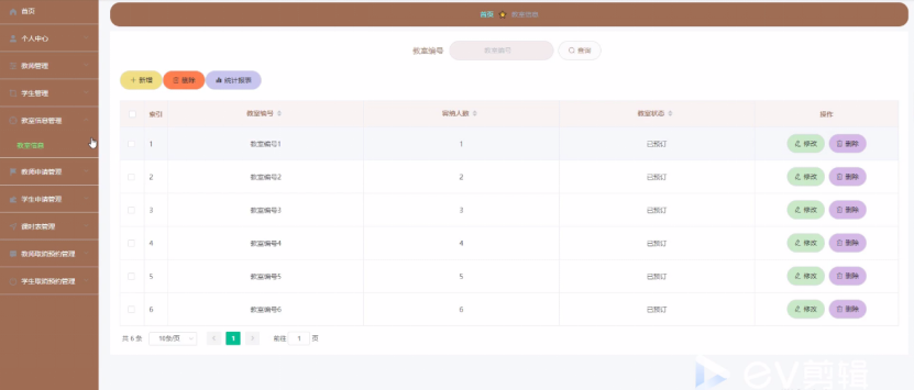 教室信息管理,在教室信息管理页面中可以对索引、教室编号、容纳人数、教室状态等内容进行修改或删除等操作,如图5-5所示。